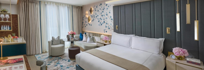 From the moment you step through the doors, you’ll be greeted by a world of luxury and indulgence. The hotel’s interior design perfectly blends contemporary and classic styles, featuring sleek lines, sumptuous fabrics, and exquisite artwork. The attention to detail is evident in every corner, from the sparkling chandeliers to the bespoke furnishings.