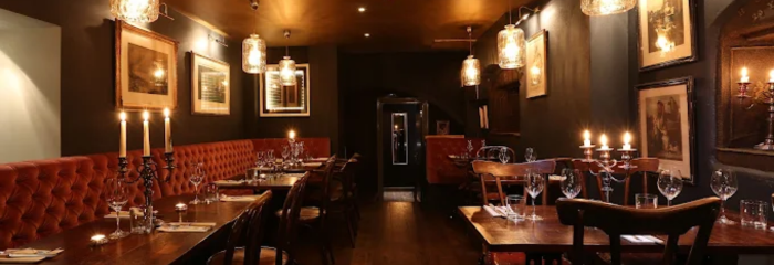The space is compact, atmospheric, and intimate. Dark, moody interiors, rose-hued velvet banquettes, and candle-dappled warmth evoke a bygone era, making it an enveloping setting—ideal for focused conversation without distractions. Architecturally, the building is an 18th-century Georgian townhouse, replete with original ovens and brick vaults in the basement.