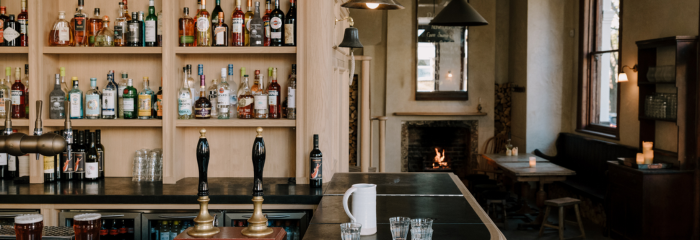 The ambience is quietly modern, blending stripped-back décor with countryside charm—think vintage furnishings, dried flowers, lime plaster tones, and an inviting bar at its heart—capturing a balance between comfort and thoughtful hospitality.
