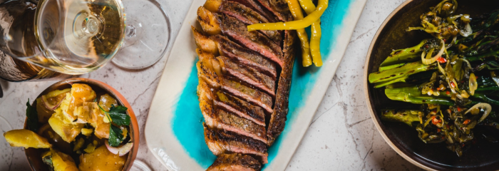 The restaurant’s story is rooted in summers wandering through the Greek islands — its founders’ love for feta, olive oil, shared plates, rustic textures and bold flavours are very much etched into its DNA. The menu is designed around mezze, raw plates, grills and sharing dishes, balancing lightness, depth, fragrance and texture. Starters light up with smoked aubergine with crispy onions, spicy feta with red pepper chimichurri, tarama & trout roe, saganaki tapioca bites (sesame, thyme, honey), and courgette tempura with black garlic aioli.